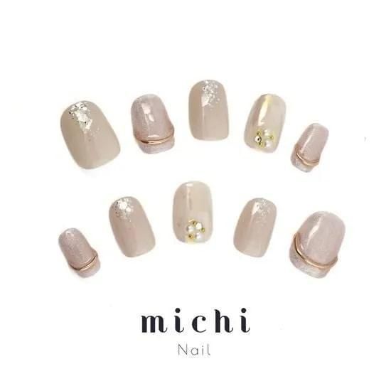 ピンクベージュにホワイトが混ざり合う深みのある色合いに、ゴールドの輝きをプラスすることで、シンプルながらも大人の上品さが漂う指先に仕上がります。