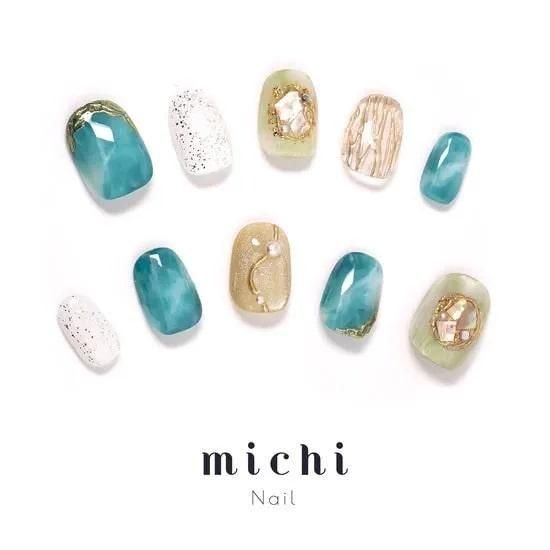 淡いブルーとグリーンを組み合わせた、リアルな天然石風のデザインが印象的なネイルチップ。