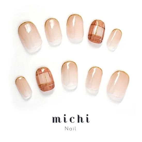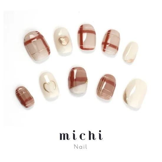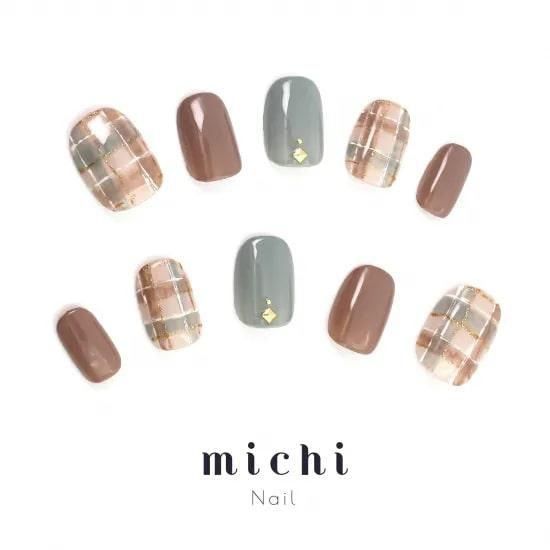 温かみのあるブラウン系でまとめたワンポイントのチェック柄がポイントで、指先をきれいに見せつつ季節感もしっかり演出できます。