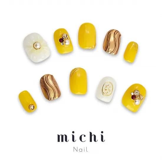 ほんのりマスタード感のある鮮やかなイエローをメインに使ったネイルチップです。